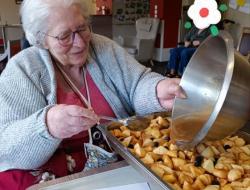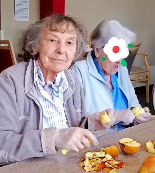 De retour à l'atelier cuisine, place à la transformation : compote maison et crumble dorée ont été préparés avec soin, dans une ambiance joyeuse et participative. L'odeur a envahi les couloirs, annonçant un goûter aussi réconfortant que joyeux.